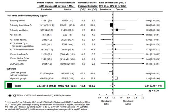 In Solidarity trial, Remdesivir showed a RR=0.95 towards Death rate ratios and will continue to enrol patients to further evaluate the small benefit. Combining data appropriately from all 4 trials as mentioned in the same article pertaining to the meta-analysis of mortality (Remdesivir Meta-analysis – Table 1 below), the Remdesivir vs control death rate ratio (RR) is 0.91 (95% CI 0.79-1.05), showing a small benefit with Remdesivir.