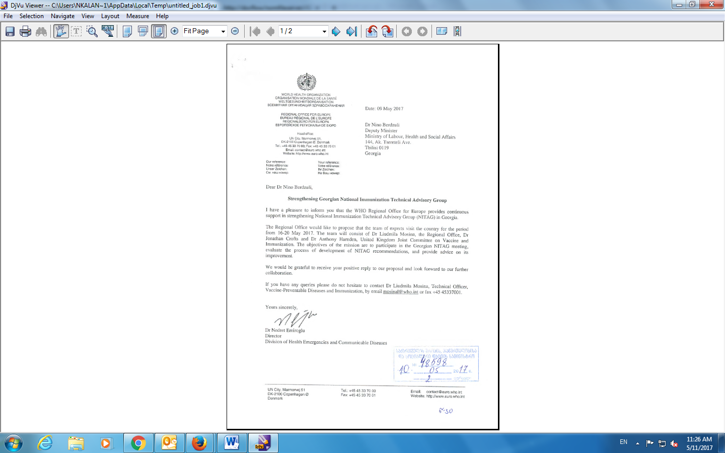 Cc: sbelkania@moh.gov.ge <sbelkania@moh.gov.ge>, geomission.geneva@mfa.gov.ge <geomission.geneva@mfa.gov.ge>, Copenhagen.emb@mfa.gov.ge <Copenhagen.emb@mfa.gov.ge>, niels.scott@undp.org <niels.scott@undp.org>, registry.ge@undp.org <registry.ge@undp.org>, IVANUSA, Marijan <ivanusam@who.int>, MOSINA, Liudmila <mosinal@who.int>, KURTSIKASHVILI, Giorgi <kurtsikashvilig@who.int>