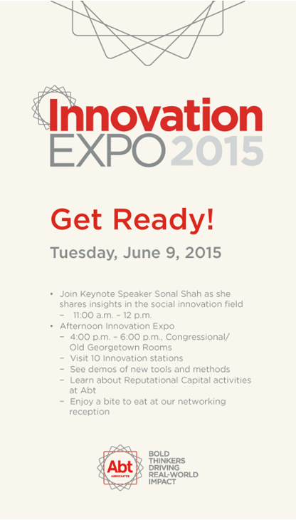 I invite you to join our inaugural Innovation Keynote Speaker, Sonal Shah, as she kicks off this year’s Innovation Expo on Tuesday, June 9th, 2015 from 11am -12pm EDT.