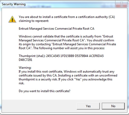 6. In the Security Warning box, confirm installation by selecting Yes.