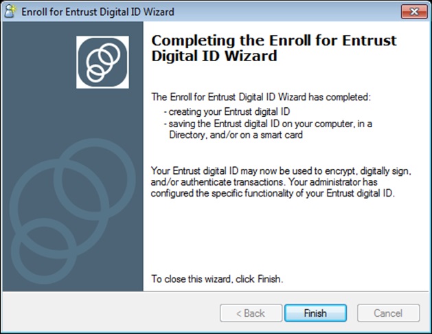 7. Please validate that the message states The Enroll for Entrust Digital ID Wizard has completed.  If so, press Finish.