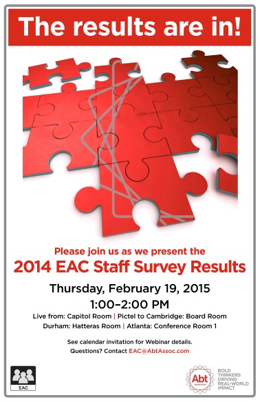 During the month of October, the EAC fielded the 12th annual staff survey. Over 1,300 Abt employees completed the survey for a company-wide response rate of 69%!  Results will be presented to staff on February 18 from Cambridge and February 19 from Bethesda. Presentations from Jordan and Nigeria will take place in March as well as a special presentation to the Telecommunity for Abt telecommuters. View the results now on the EAC’s AGI page.
