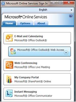 1. Go to the Microsoft Online Services (MOS) Sign in window and click the down arrow to the right of the E-Mail and Calendaring item