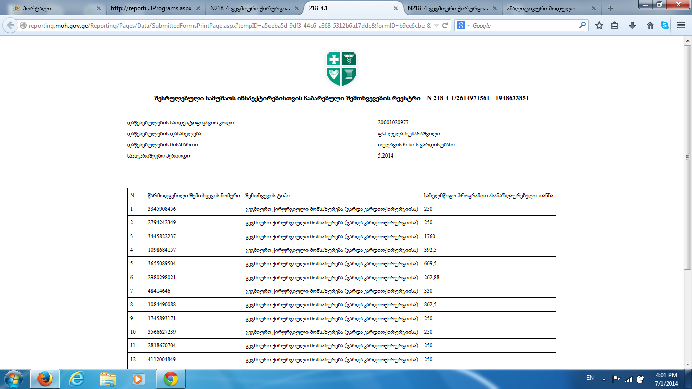 პრობლემა არის შემდეგში: რეესტრების ამოღების დროს პროგრამა აფიქსირებს დაწესებულების დასახელებაში, როგორც პროვაიდერს- ფ/პ ლელა ხუმარაშვილი.