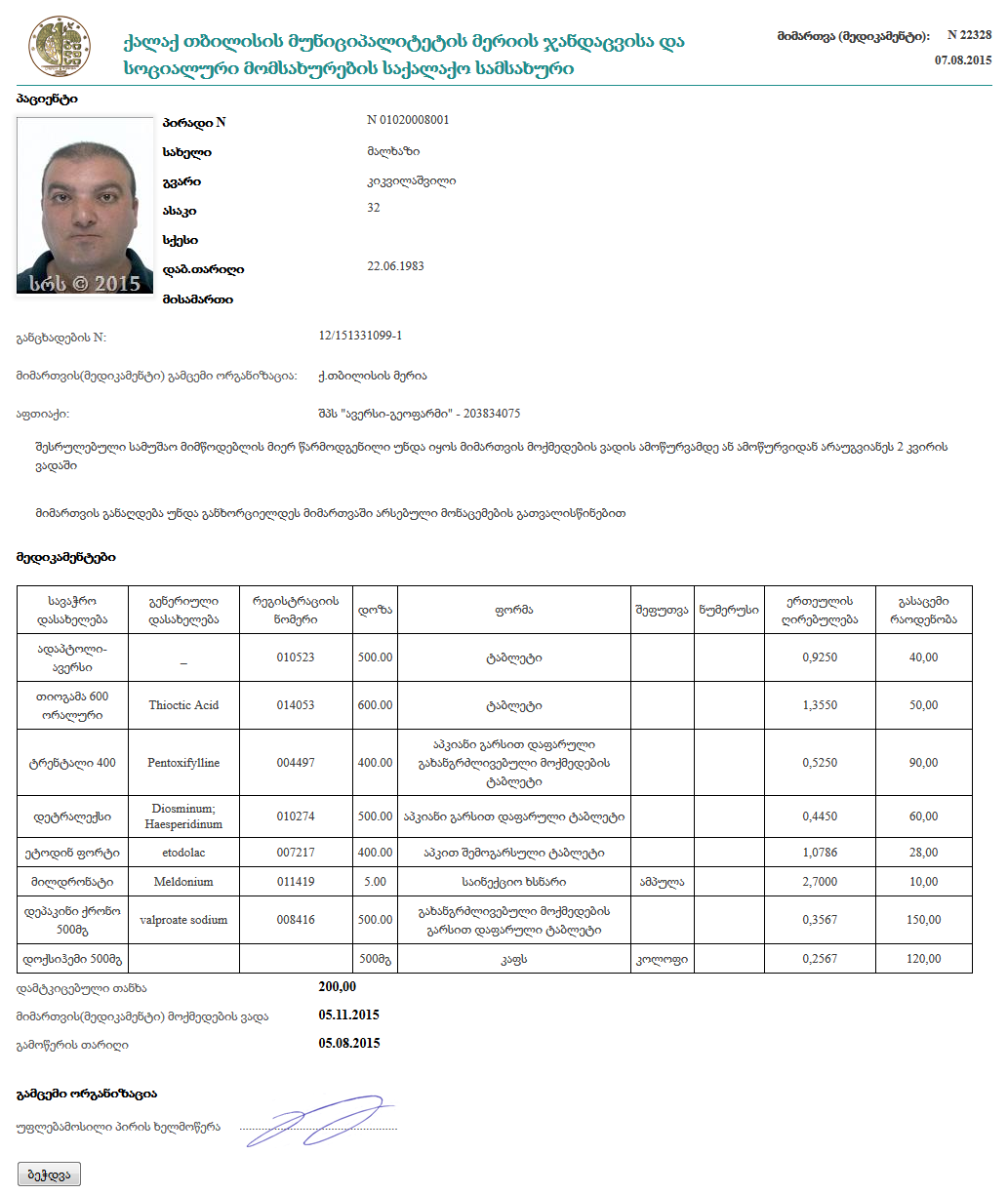 ამ რეცეპტების სრულფასოვანი შევსება (იმ ფორმატით რაზეც შევთანხმდით) დაიწყო 1აგვისტოდან ანუ როდესაც პროგრამა ამის საშუალებას იძლეოდა,შესაბამისად შესაძლოა კინკრეტულად ამ რეცეპტში არ არის მინაცემები შეყვანილი.1ის შემდეგ დარეგისტრირებულ შემთხვევებში ინფორმაცია იქნება მაქსიმალურად სრულად ასახული.როგორც ლაშას ვუთახარი, რეცეპტები ნელ ნელა იქნება სრულყოფილი,ამიტომ გარდამავალ ეტაპზე მანამ არასრულფასოვნად შევსებული რეცეპტები არ ამოიწურება,მსგავსი რეცეპტები ძველი,ხოლო სრულფასოვნად შევსებული რეცეპტები პროგრამულად უნდა განაღდდეს!