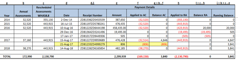 Thank you for your telephone call. I summarized in the table below the amounts we’ve received from 2014 to 2018 including their applications to identify where the difference between our records are coming from. Your records show that Georgia’s outstanding balance is USD4,640 while our records show USD3,841. The only difference is USD806 that we received on 21 August 2017 which we applied towards AC. I’ve highligted the said receipt below. Could you please confirm that this indeed was payment for AC? Please disregard the USD7 difference (USD4,647 per WHO - USD4,640 per Georgia) as this relates to UBS bank charge that we will write off.