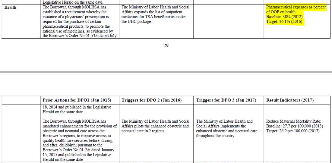 ქეთი, მადლობა ამ ინფორმაციისთვის, თუმცა ამ მონაცემებმა გარკვეული კითხვები გააჩინა. გიზიარებთ 2015 წელს დამტკიცებულ დოკუმენტიდან (http://projects.worldbank.org/P149991/null?lang=en გვ 29) ამონარიდს რეფორმებისა და ინდიკატორის შესახებ, რომლის მიხედვითაც წამლებზე დანახარჯის შეფარდება ჯანდაცვაზე ჯიბიდან გადახდილი თანხებთან  უნდა შემცირებულიყო 38 პროცენტიდან (2012)  36 პროცენტამდე (2016). ქვემოთ მოწოდებული მონაცემებით კი 2016 წელს ეს ინდიკატორი 58 პროცენტამდეა გაზრდილი. გთხოვთ დაგვეხმარეთ რომ გავერკვეთ.