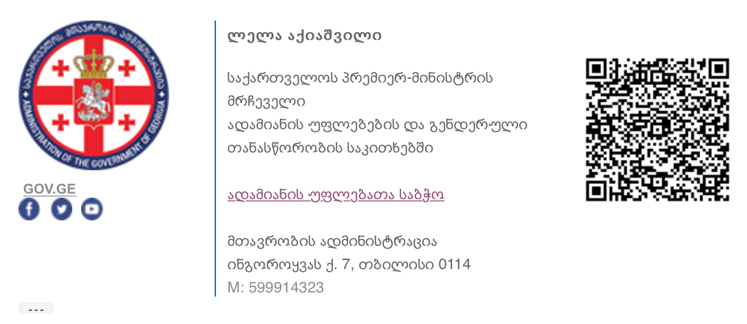 ვსარგებლობ შემთხვევით და აქვე ვუხდი მადლობას კოლეგებს საქართველოს პარლამენტიდან ანგარიშის დამუშავებისა და დამტკიცებისთვის და გაეროს ქალთა ორგანიზაციას ტექნიკური და ექსპერტული მხარდაჭერისთვის. ასევე, კოლეგებს საქართველოს მთავრობის ადმინისტრაციის ადამიანის უფლებათა სამდივნოდან მათი უშრეტი ენერგიისა და დაუღალავი შრომისათვის.