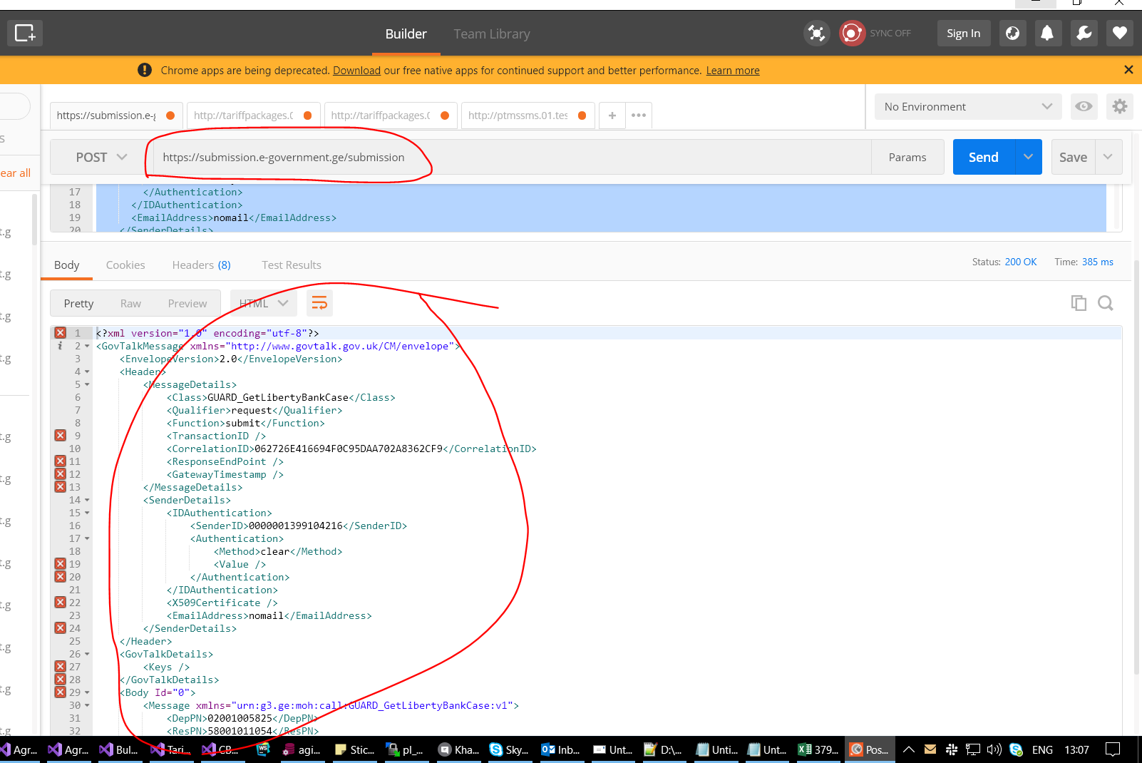 xml version="1.0" encoding="UTF-8" <GovTalkMessage xmlns="http://www.govtalk.gov.uk/CM/envelope"> <EnvelopeVersion>2.0EnvelopeVersion> <Header> <MessageDetails> <Class>GUARD_GetLibertyBankCaseClass> <Qualifier>requestQualifier> <Function>submitFunction> <TransactionID /> <CorrelationID>686DDAE644454596AF24FCB59B138378CorrelationID> <ResponseEndPoint /> <GatewayTimestamp /> MessageDetails> <SenderDetails> <IDAuthentication> <SenderID>0000001399104216SenderID> <Authentication> <Method>clearMethod> <Value /> Authentication> IDAuthentication> <X509Certificate /> <EmailAddress>nomailEmailAddress> SenderDetails> Header> <GovTalkDetails> <Keys /> GovTalkDetails> <Body Id="0"> <Message xmlns="urn:g3.ge:moh:call:GUARD_GetLibertyBankCase:v1"> <DepPN>02001005825DepPN> <ResPN>58001011054ResPN> <UserName>liberty_bankUserName> <Password>Lb@nk74555Password> Message> Body> GovTalkMessage>